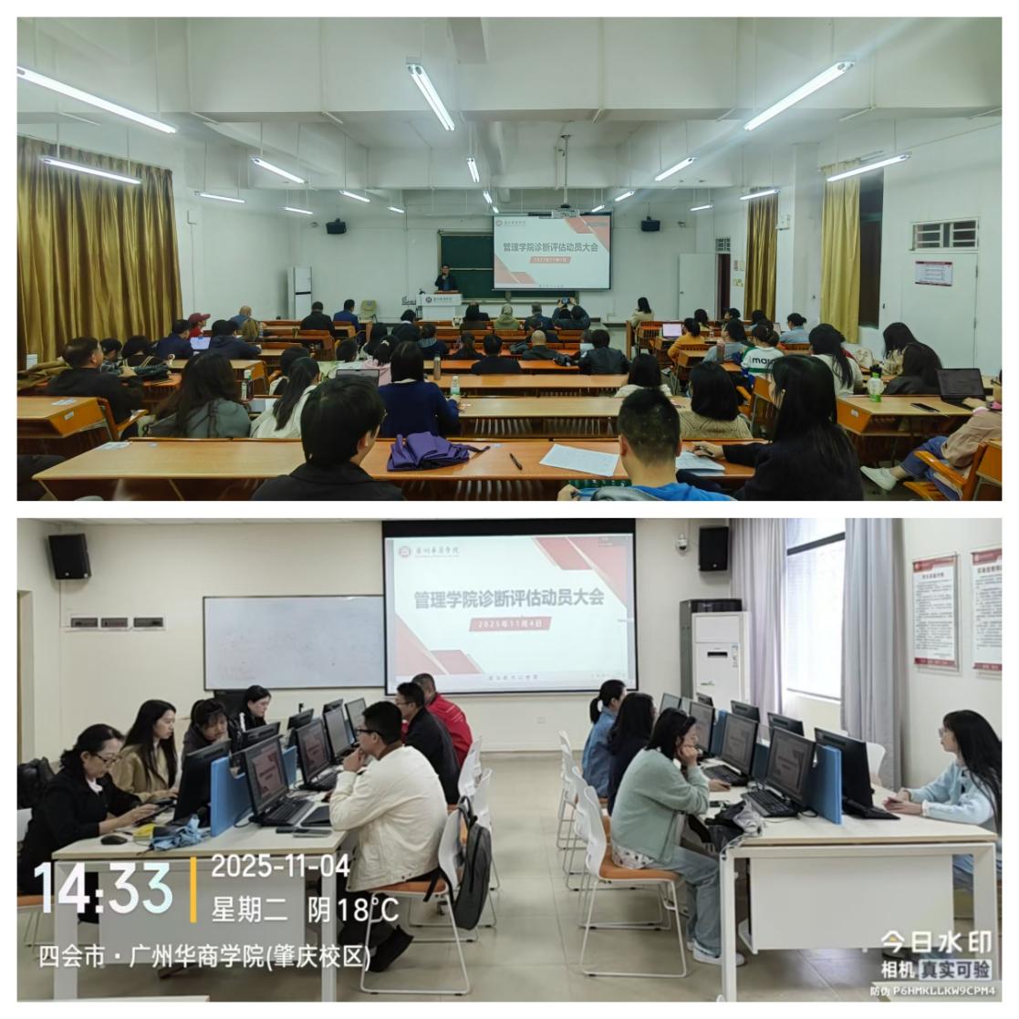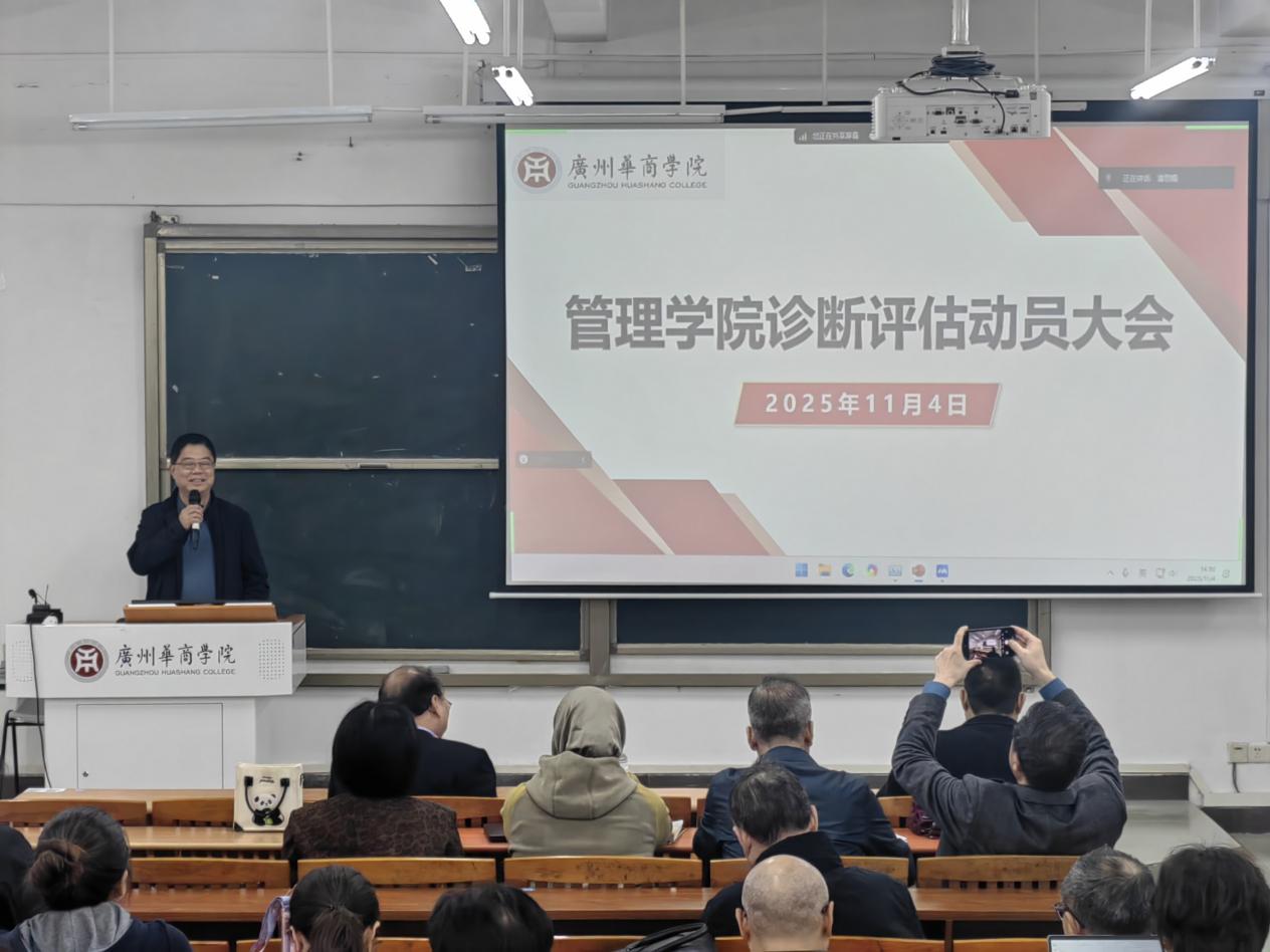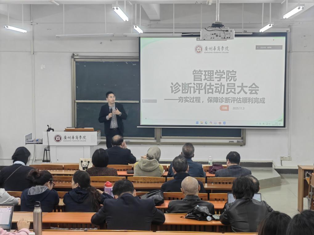 为全面迎接2026年教育部本科教学工作合格评估,扎实做好预评估各项准备工作,2025年11月4日,管理学院在广州校区与肇庆校区同步召开了管理学院诊断评估动员大会。会议系统阐释了合格评估的重大意义、核心要求与关键任务,全面部署了诊断评估阶段的具体工作安排,进一步统一思想、压实责任、激发干劲,为高质量通过教育部本科教学工作合格评估奠定坚实基础。刘少波副校长出席会议并讲话,袁仕海副院长作工作部署,史传林院长就评估工作进行总结和重点强调,学院领导班子成员及全体教职工参加了会议,会议由院长助理潘思媚主持。