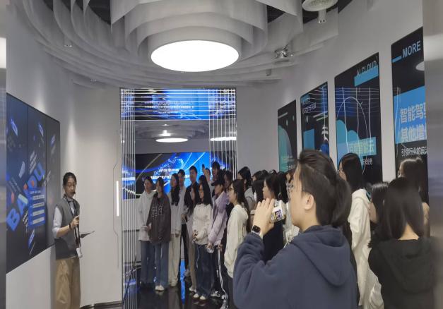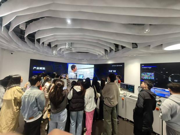 随后,师生们前往百度飞桨(广州)中心展厅开展实地参访。作为百度飞桨在广州的核心展示窗口,该展厅集中展示了百度飞桨在人工智能领域的最新技术成果、创新应用及跨行业落地案例。展厅内通过丰富的实物展品、互动体验区及多媒体展示形式,全方位呈现人工智能技术原理、百度飞桨深度学习平台核心功能及人工智能在多领域的应用场景,师生们还现场体验了数字人等前沿科技成果,全面且直观地理解人工智能技术体系,以及技术对智能未来发展的支撑作用。