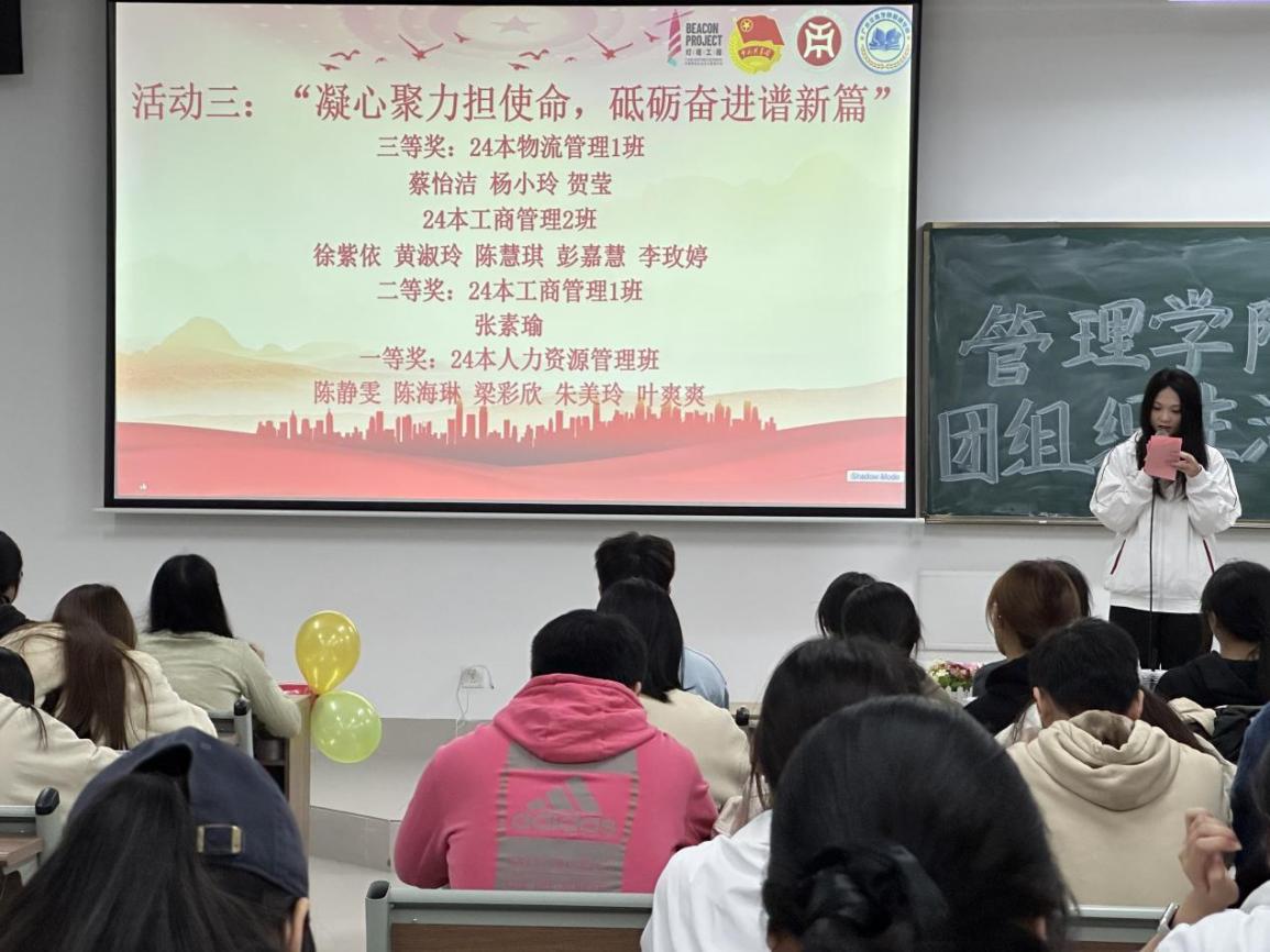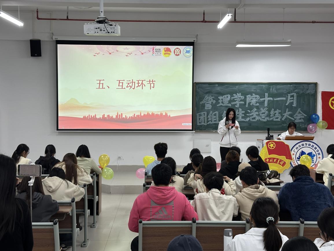 本次团组织生活总结大会由管理学院团委常委团成员侯琪琪师姐为本月的团生活动做出总结。侯琪琪师姐呼吁广大青年要深入学习党的二十届四中全会精神,用党的全会精神武装自身,并将其落实到我们的社会实践中来,在新时代的伟大征程中砥砺前行,既要为祖国做贡献,也要努力实现自己的人生价值!学姐的殷勤寄语引起了同学们的共鸣,大家用热烈的掌声表达了自己的支持。
