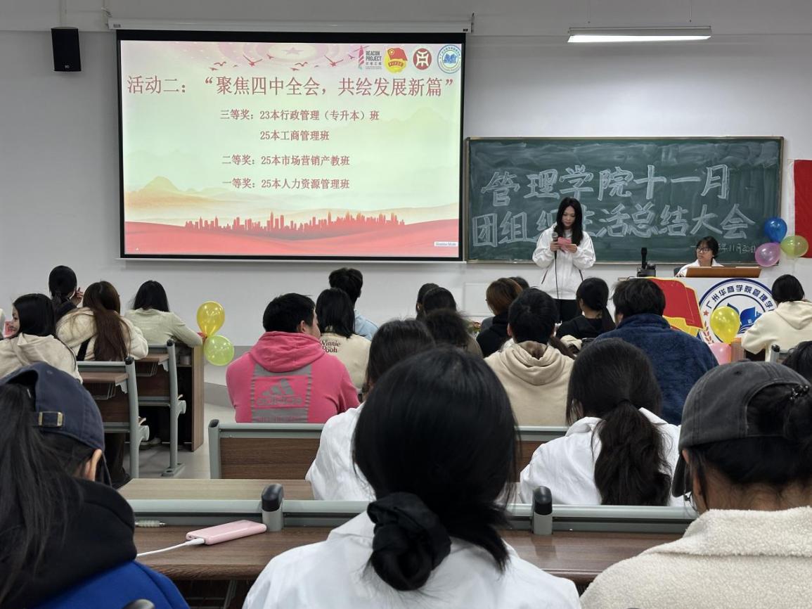 为让同学们更好地学习党的二十届四中全会精神,更好地用党的二十届四中全会精神武装自身,更好地贯彻落实党的二十届四中全会精神。管理学院团委组织部于11月20号晚19:00在肇庆校区16号楼310开展了以“党的二十届四中全会精神”为主题的十一月团组织生活总结大会。接下来让我们一起回顾一下那些精彩的大会瞬间吧!